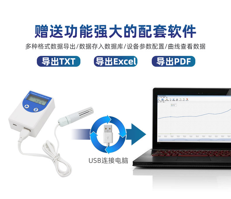 到達目的地后,智能溫濕度記錄儀可以通過USB線連接電腦,配合配套的軟件可以將設(shè)備中已存儲的數(shù)據(jù)以EXCEL/TXT/PDF等格式導(dǎo)出到電腦,以供接收方查看運輸過程中的數(shù)據(jù),方便后續(xù)報表制作及數(shù)據(jù)分析。