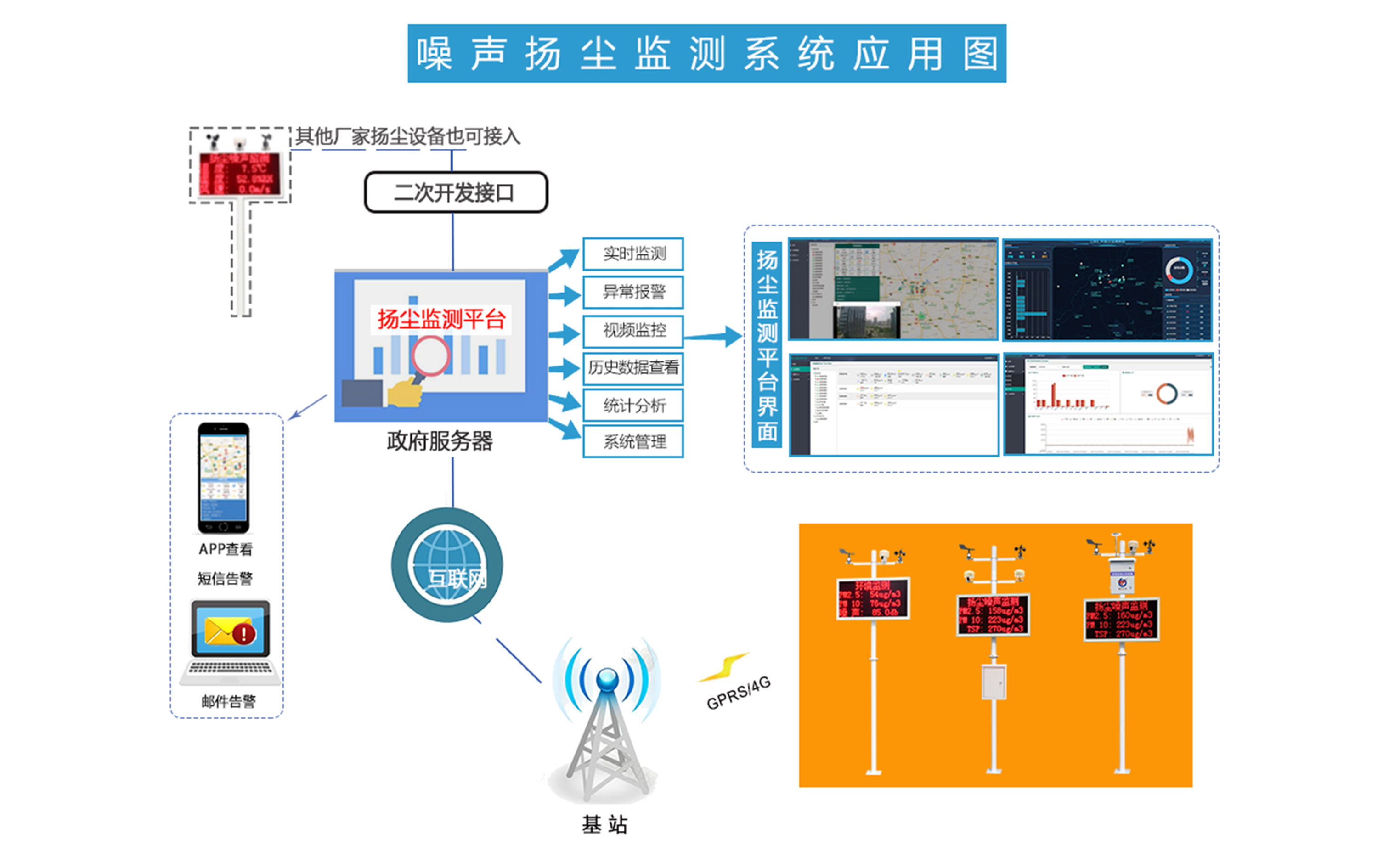 建大仁科揚(yáng)塵監(jiān)測(cè)系統(tǒng)由噪聲揚(yáng)塵監(jiān)測(cè)站、傳輸系統(tǒng)、監(jiān)控軟件云平臺(tái)及噴淋系統(tǒng)(霧炮)組成,能夠?qū)ΜF(xiàn)場(chǎng)環(huán)境的PM2.5、PM10、環(huán)境溫濕度及風(fēng)速、風(fēng)向及風(fēng)力監(jiān)測(cè)、噪聲監(jiān)測(cè)等10項(xiàng)要素的實(shí)時(shí)監(jiān)測(cè);通過GPRS/4G網(wǎng)絡(luò)傳輸?shù)奖O(jiān)控平臺(tái),同時(shí)具備超限警報(bào)、智能聯(lián)動(dòng)功能,實(shí)現(xiàn)自動(dòng)監(jiān)測(cè)控制。