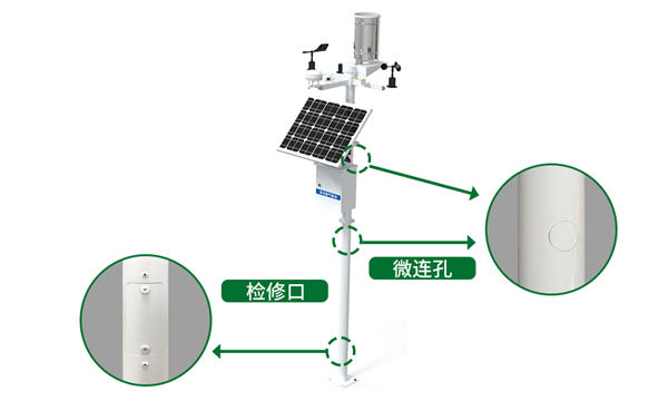 建大仁科氣象站桿體:建大仁科經(jīng)過(guò)精密計(jì)算,摒棄傳統(tǒng)供電方式,立桿上設(shè)有微連孔,防水對(duì)插線(xiàn)均走桿體內(nèi)。微連孔若不使用則與桿為一個(gè)整體,外觀美觀,防護(hù)性能好;使用時(shí),線(xiàn)槽用小錘輕輕敲掉,即能完成走線(xiàn)。